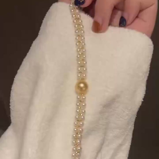 Experience the pinnacle of our 2026 collection. This high-quality bracelet is a study in luxurious contrast, designed to revolve around a magnificent centerpiece: a rare 10-11mm Golden South Sea Pearl, known for its deep, warm luster. It is elegantly framed by a delicate strand of dainty 3.5-4.5mm white freshwater pearls. Crafted with S925 sterling silver and finished with rich gold plating for unparalleled radiance. An adjustable chain ensures a perfect, custom fit.